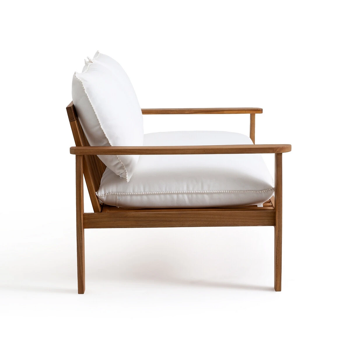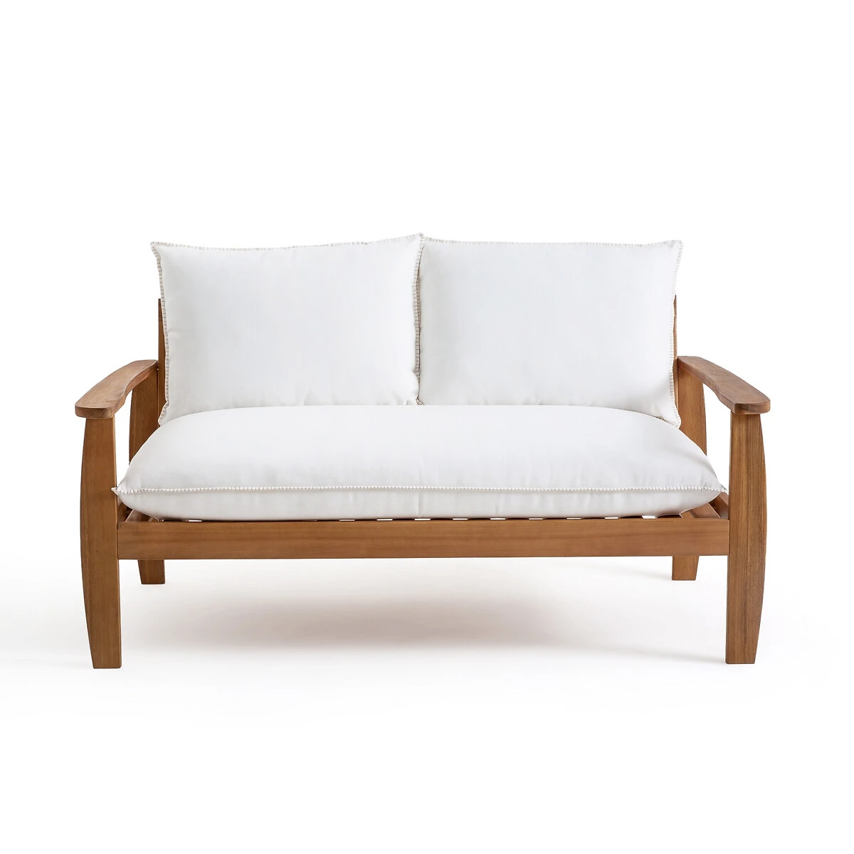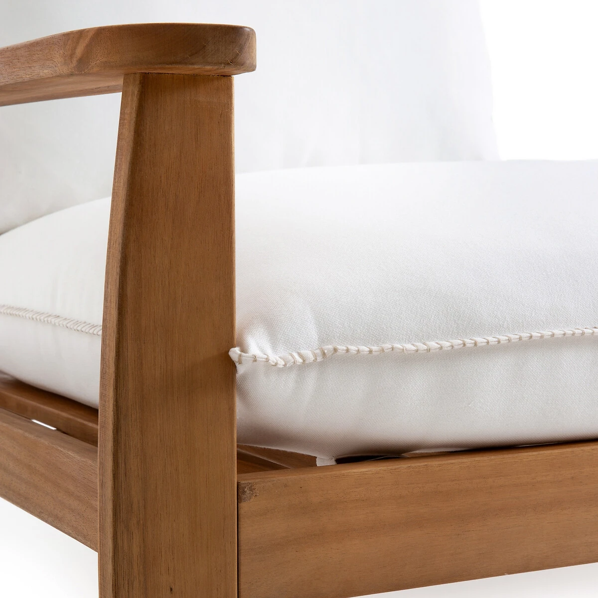 Avec son dossier légèrement incliné et ses larges accoudoirs à la façon des « Adirondack », cette banquette de jardin offre une assise particulièrement confortable. Ses coussins traités outdoor peuvent rester en place même en cas d’intempéries.