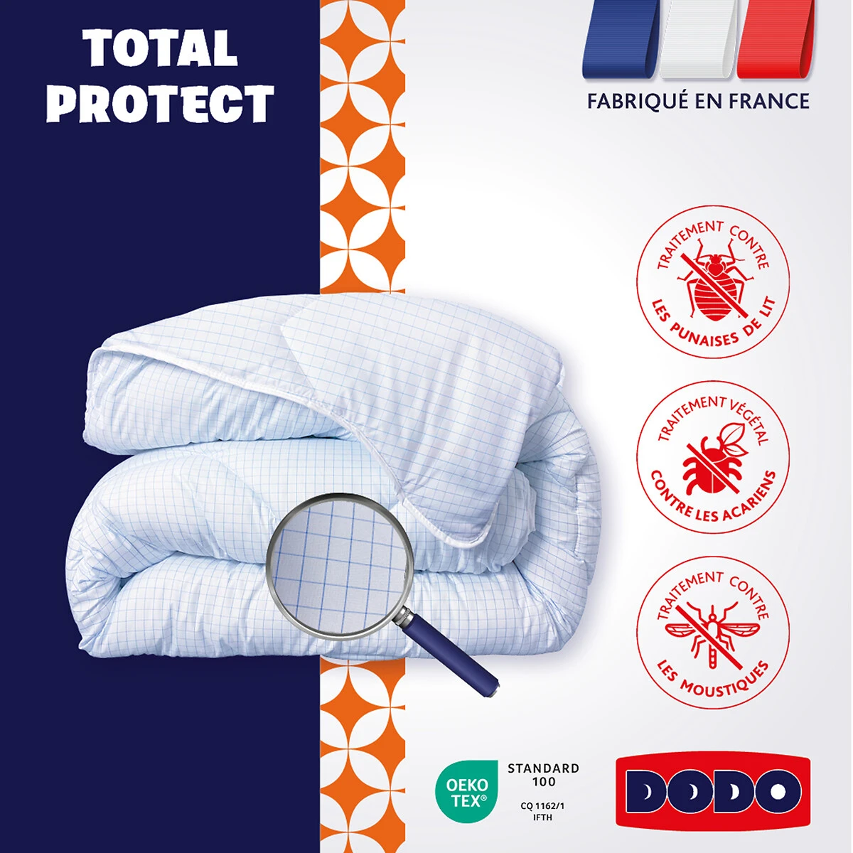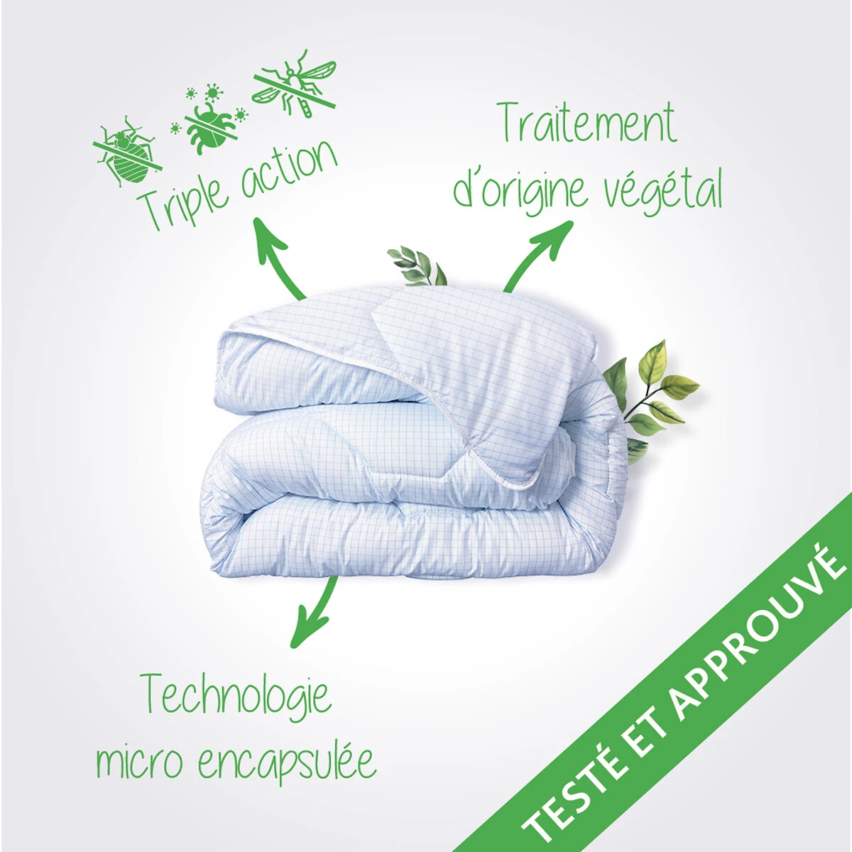Grâce au procédé Topcool, cette couette assure une excellente régulation de la température et une évacuation optimale de la transpiration. De plus, elle est dotée d’un traitement anti-acariens, anti-punaises de lit et anti-moustiques efficace, vous offrant une protection supplémentaire.