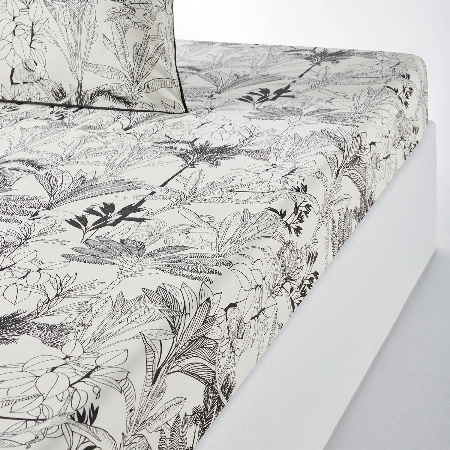 « Pour créer le linge de lit Palmeira, je me suis inspirée des gravures anciennes de paysages exotiques. Son motif exclusif est dessiné au trait en noir et blanc. Une jungle foisonnante et dense où se dissimulent singes, lémuriens et léopards. Tissée dans une percale pur coton, soulignée d’un biais noir, Palmeira crée une atmosphère exotique et graphique dans la chambre. »