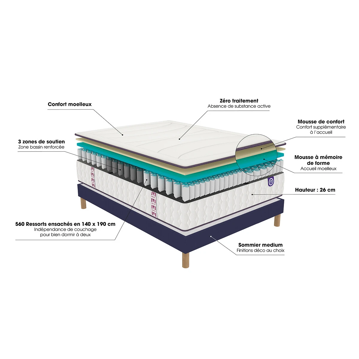 • Type de matelas : Ressorts ensachés, 5 zones de confort différenciées