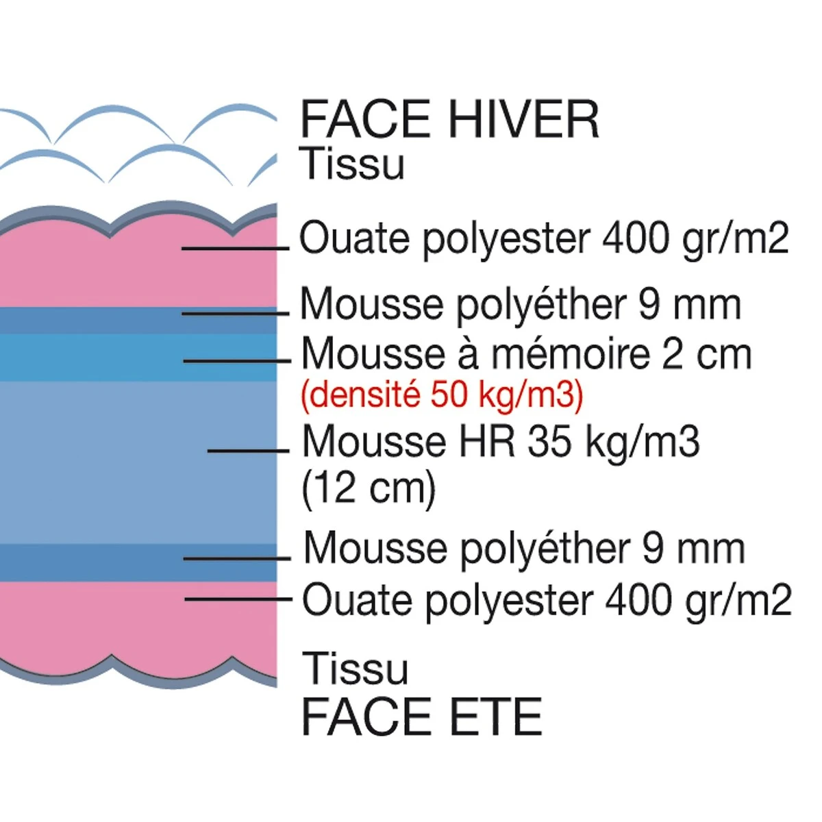 • Âme : mousse haute résilience (densité 35 kg/m³, épaisseur 12 cm) associé à une mousse à mémoire de forme qui s’adapte parfaitement à chaque morphologie (densité 50 kg/m³, épaisseur 2 cm).