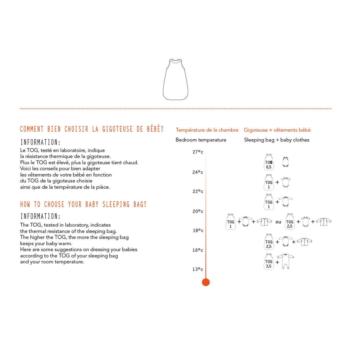 Nos gigoteuses sont donc aujourd’hui conçues pour répondre à cette nouvelle norme, c’est pourquoi vous pourrez constater que les largeurs d’encolures sont désormais plus petites et que l’épaisseur du rembourrage est également moins importante. • Le TOG testé en laboratoire et noté de 1 à 10 indique la résistance thermique de la gigoteuse. Plus le TOG est élevé, plus la gigoteuse tient chaud.