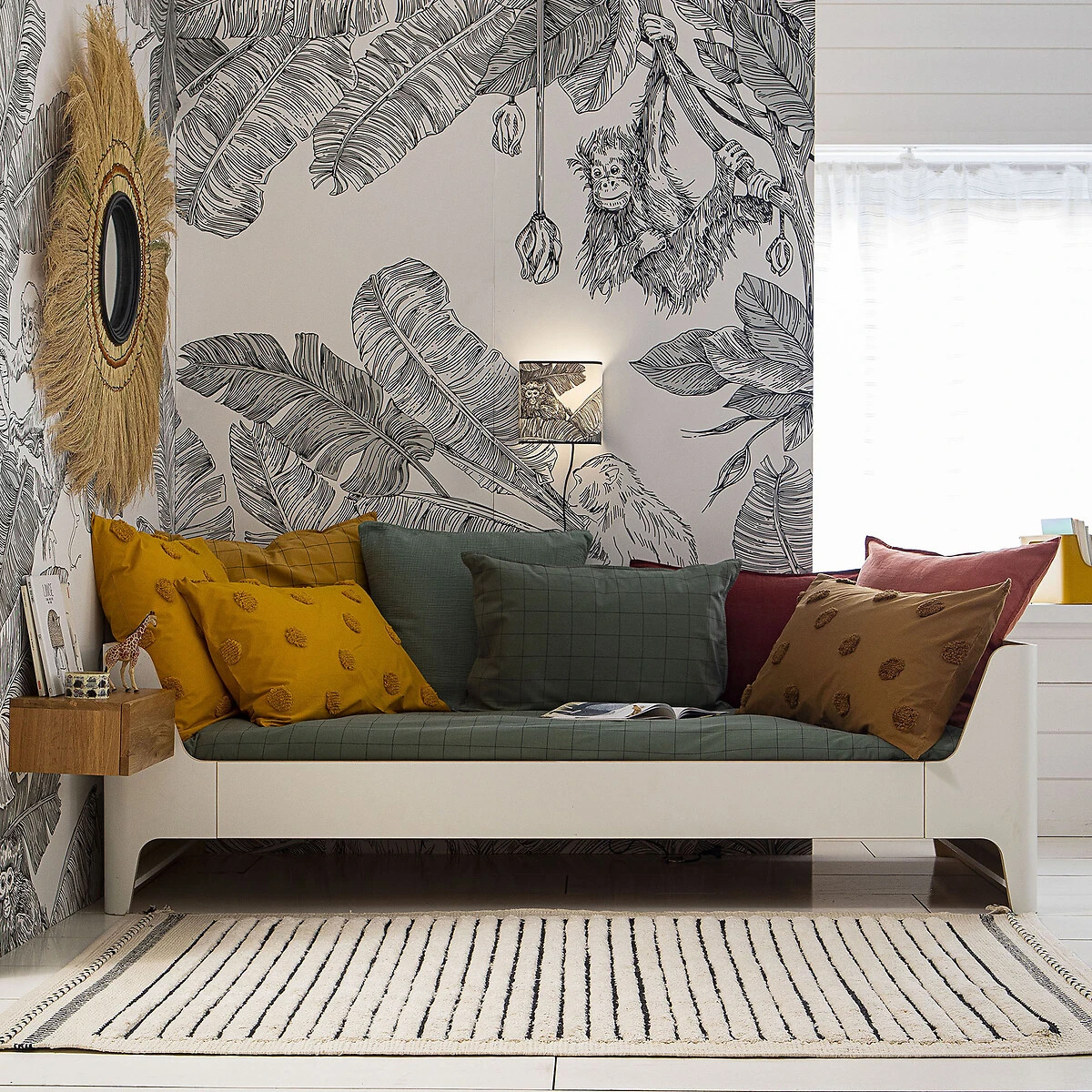 Le miroir en rotin Mane. Ses dimensions généreuses et ses finitions frangées théâtralisent le décor et agrandissent l’espace dans un jeu de reflets et de lumière.