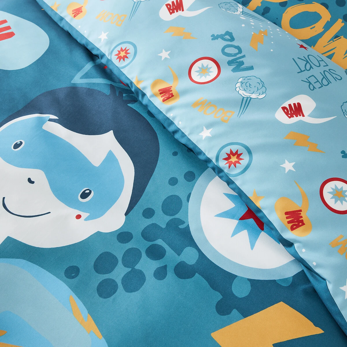 • Housse de couette : recto imprimé « Super fort », verso imprimé petits motifs