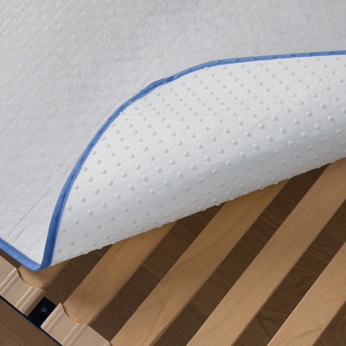• 100 % polyester (500g/m²) avec une face incrustée de picots souples à poser sur les lattes, qui empêche le matelas de glisser et évite ainsi l’usure du coutil
